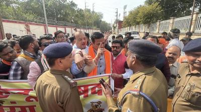 नगर निगम पर प्रदर्शन, बैरिकेडिंग के बीच कार्यकर्ताओं ने किया हनुमान चालीसा का पाठ