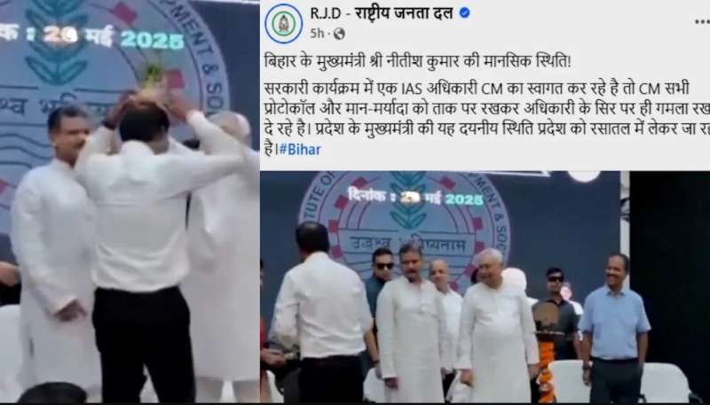 वीडियो वायरल होने के बाद राजद ने शेयर किया है। पार्टी ने लिखा, बिहार के मुख्यमंत्री नीतीश की मानसिक स्थिति! सरकारी कार्यक्रम में एक आईएएस अधिकारी सीएम का स्वागत कर रहे हैं, वहीं सीएम सभी प्रोटोकॉल और मान-मर्यादा को ताक पर रखकर अधिकारी के सिर पर ही गमला रख दे रहे हैं।