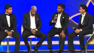भारतीय क्रिकेट कंट्रोल बोर्ड (बीसीसीआई) ने रविवार को नई दिल्ली में सम्मान समारोह आयोजित किया। इस दौरान पिछले लगभग एक साल में पांच आईसीसी ट्रॉफीज जीतने का जश्न मनाया गया। साथ ही भारतीय क्रिकेटरों को अलग-अलग अवॉर्ड से सम्मानित भी किया गया। समारोह के दौरान एंकर हर्षा भोग्ले ने वैभव सूर्यवंशी, हार्दिक पांड्या, संजू सैमसन और अभिषेक शर्मा के साथ रैपिड फायर राउंड खेला। इस दौरान चारों ने कुछ हैरान कर देने वाले जवाब दिए। आइए जानते हैं...